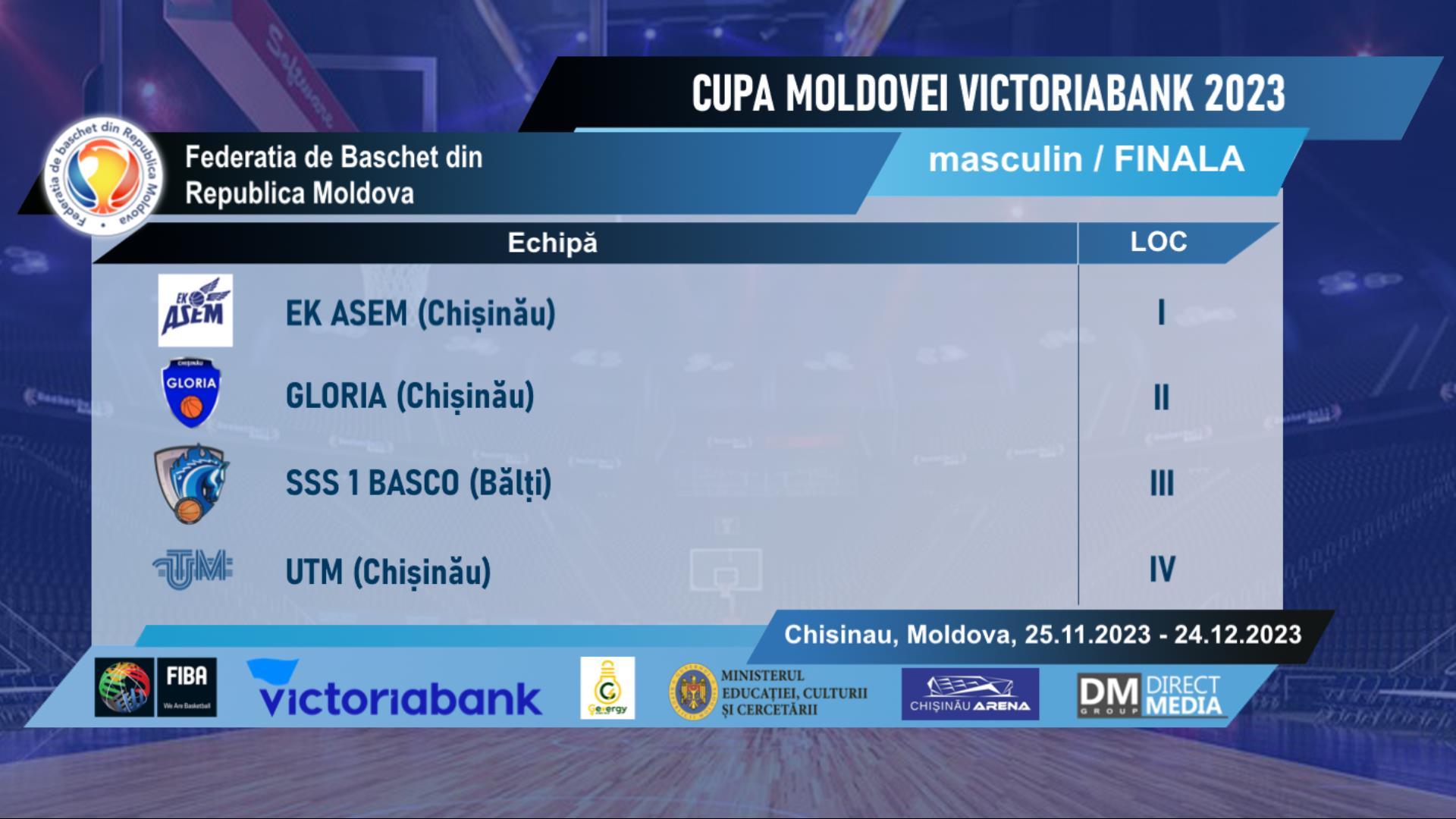 Победителя кубка определил матч «EK ASEM»(Кишинёв) — «GLORIA»(Кишинёв). Его итог — 80:65 (15:23, 20:10, 27:14, 18:18)