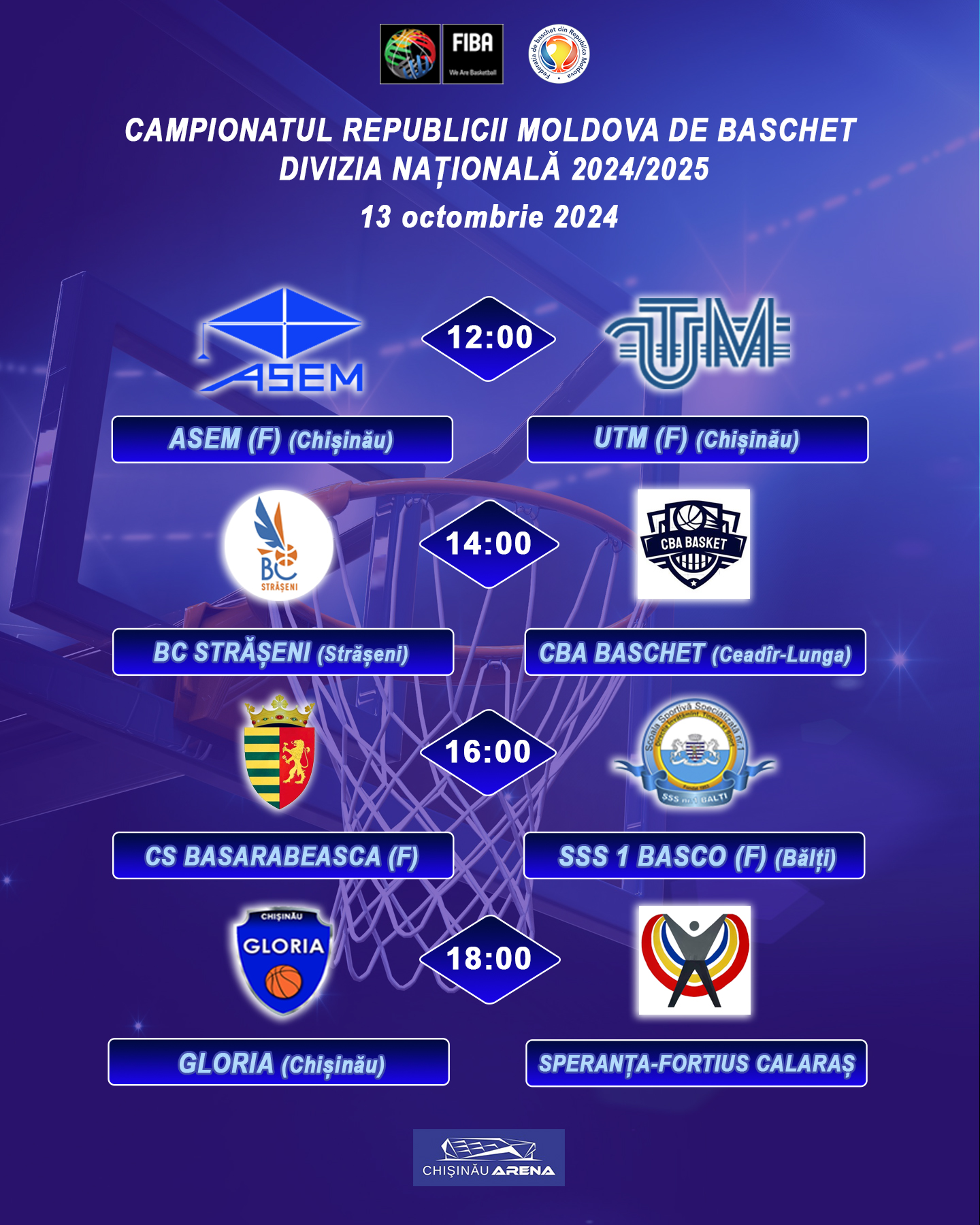 Четыре матча мужских команд пройдут в зале с/к Arena Chișinău (ул. Каля Орхеюлуй, 130).