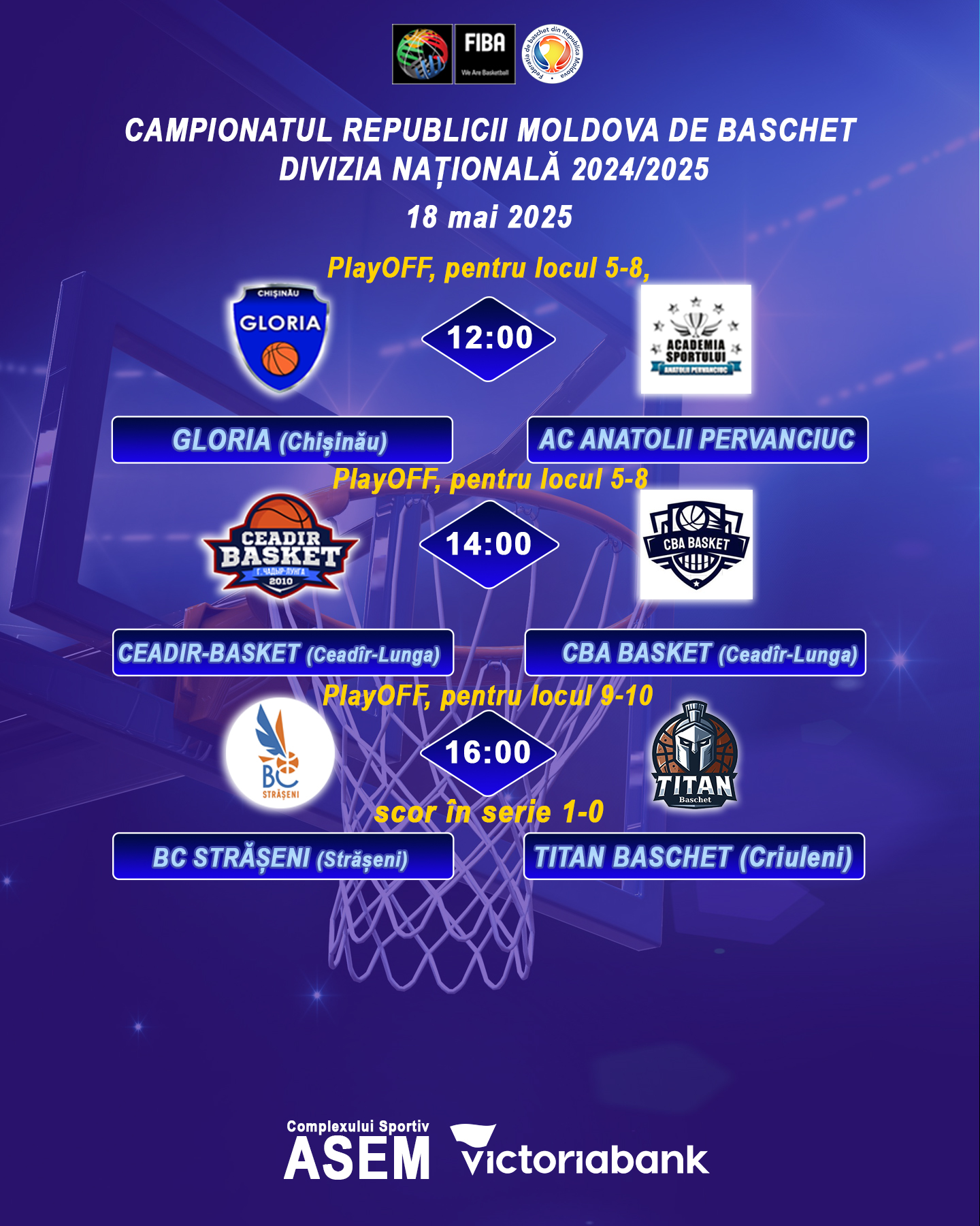 Матчи PlayOFF среди мужских и женских команд пройдут в зале спортивного комплекса ASEM, по адресу: Кишинёв, ул. Albișoara, 86/4.