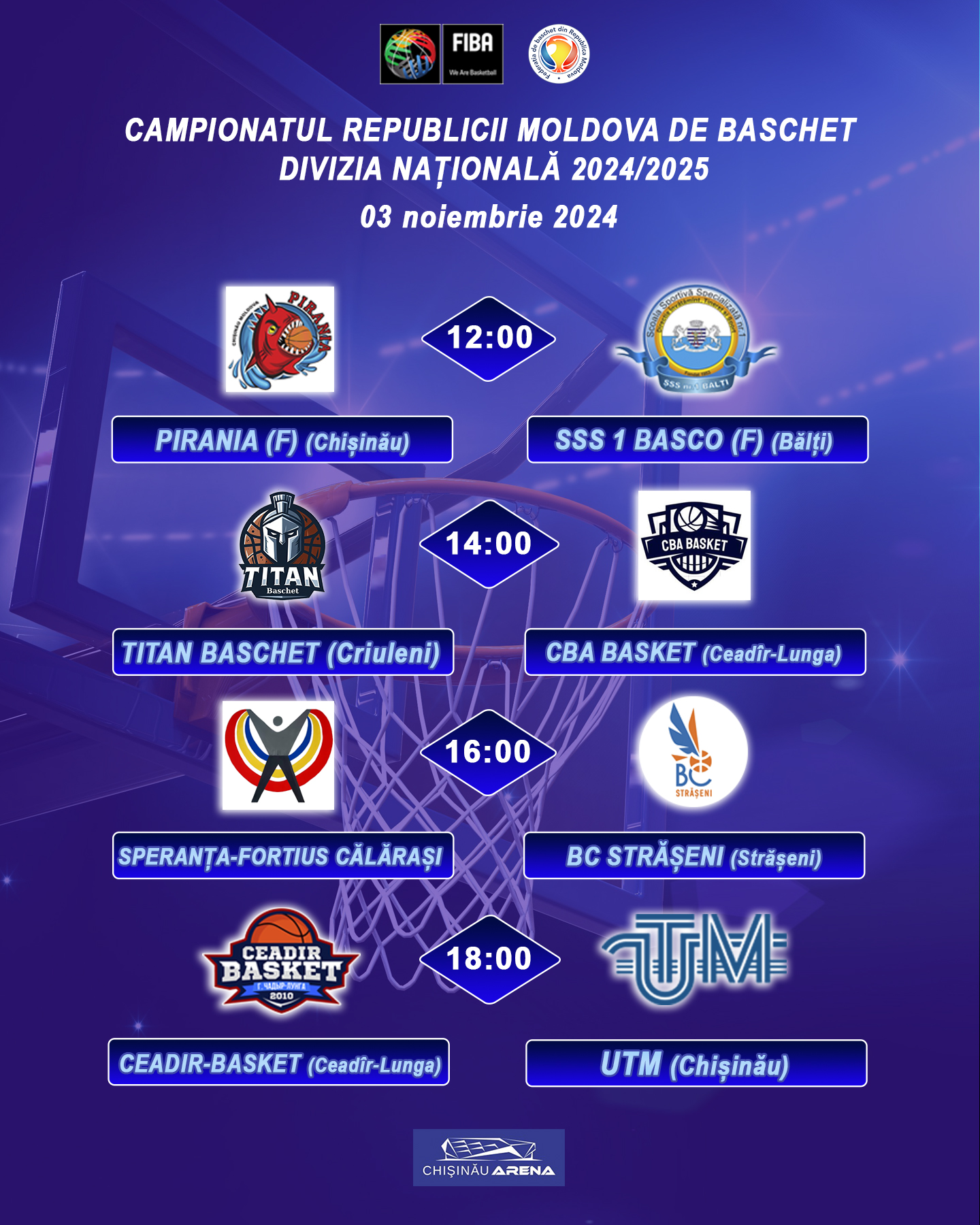 Субботние игры пройдут в зале с/к Arena Chișinău (ул. Каля Орхеюлуй, 130).