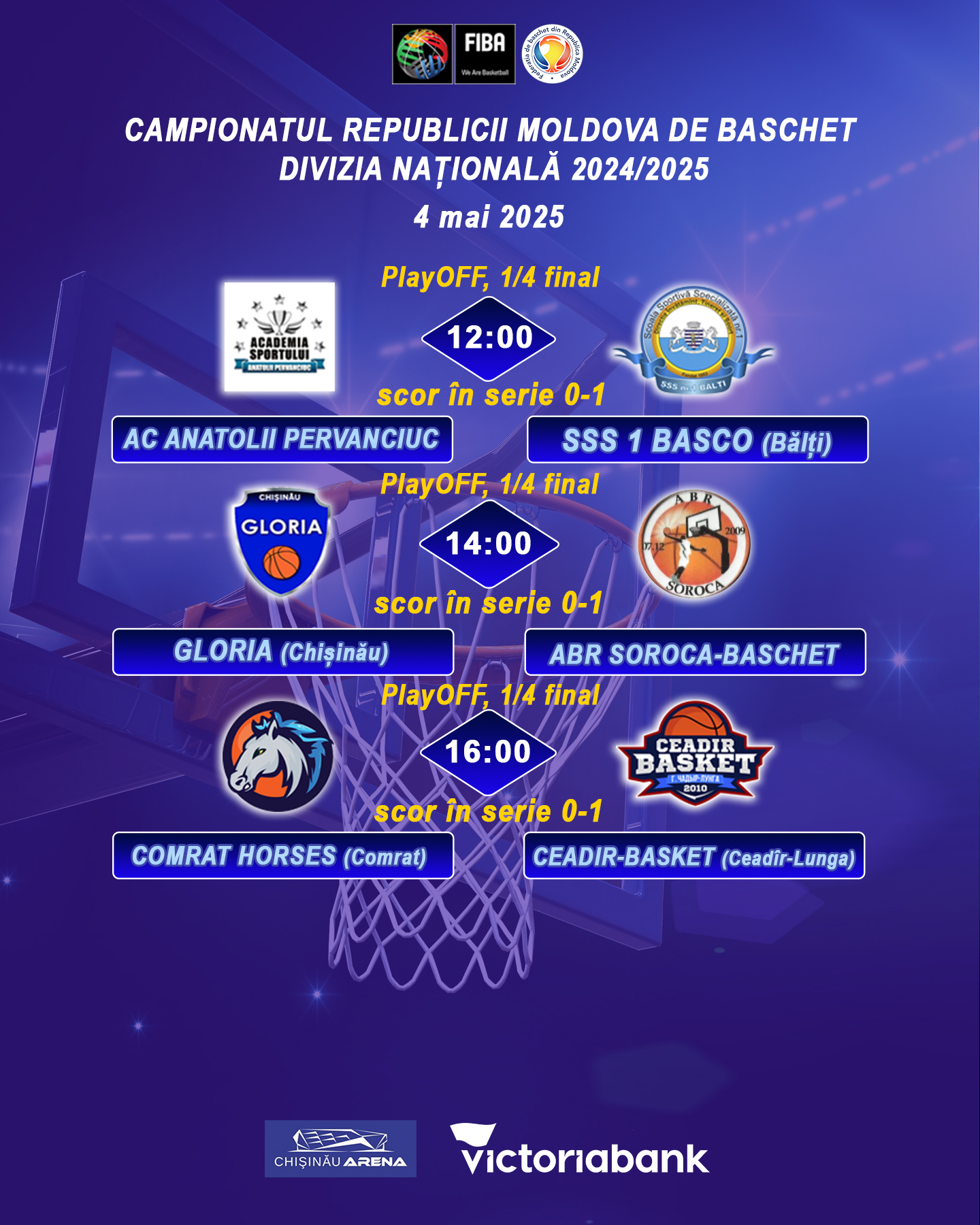 Матчи PlayOFF среди мужских и женских команд пройдут в зале с/к Arena Chișinău (ул. Каля Орхеюлуй, 130).