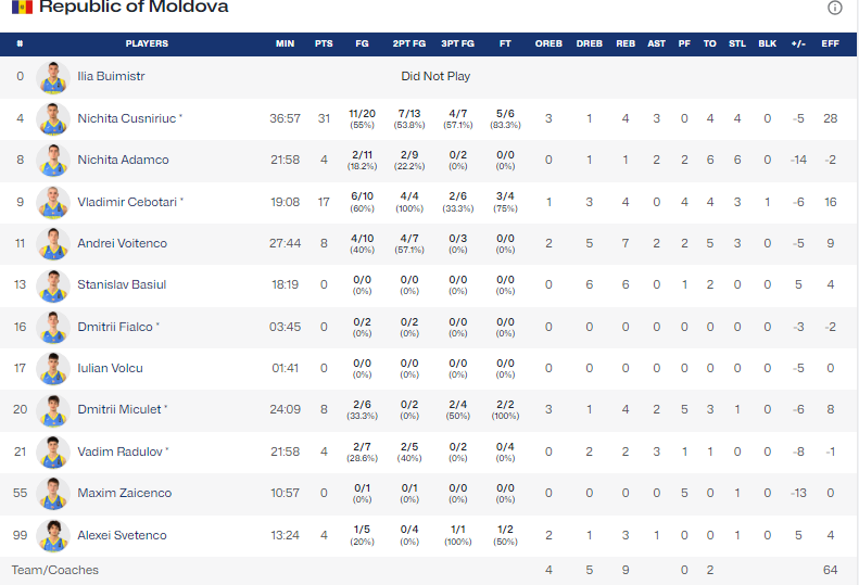 Самым результативным игроком молдавской команды в этом матче стал Никита Кушнирюк — у него 28 баллов.