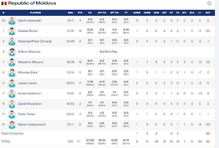 Лучшим игроком молдавской сборной оказался Массимо Макару — 25 баллов.