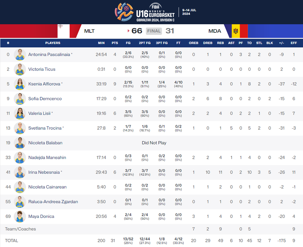 Счёт матча «Мальта-Молдова» — 66:31 (29:8; 16:7; 19:7; 12:9)