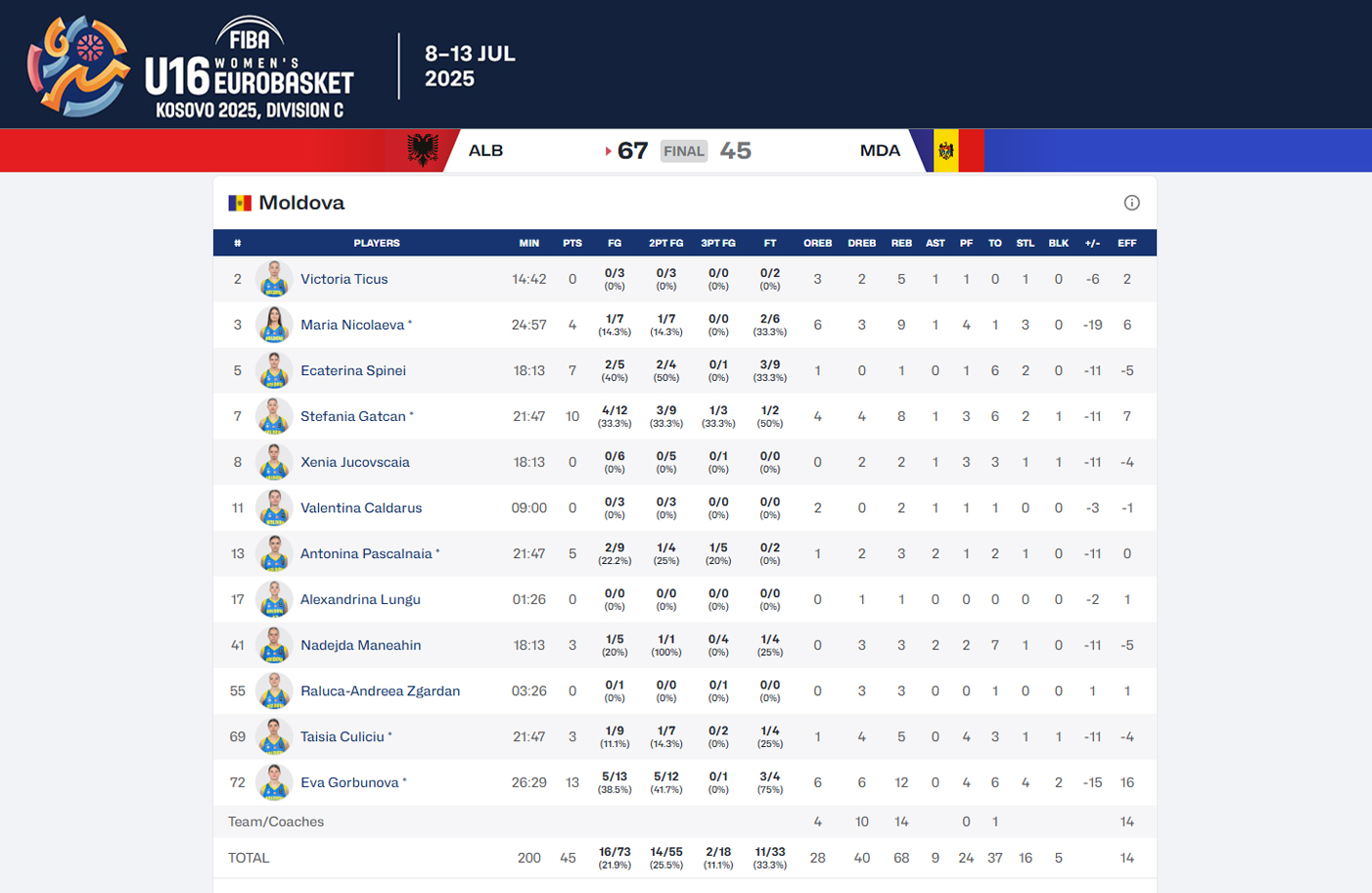 Результат матча: Албания — Молдова 67-45 (17:13, 22:10, 19:10, 9:12)