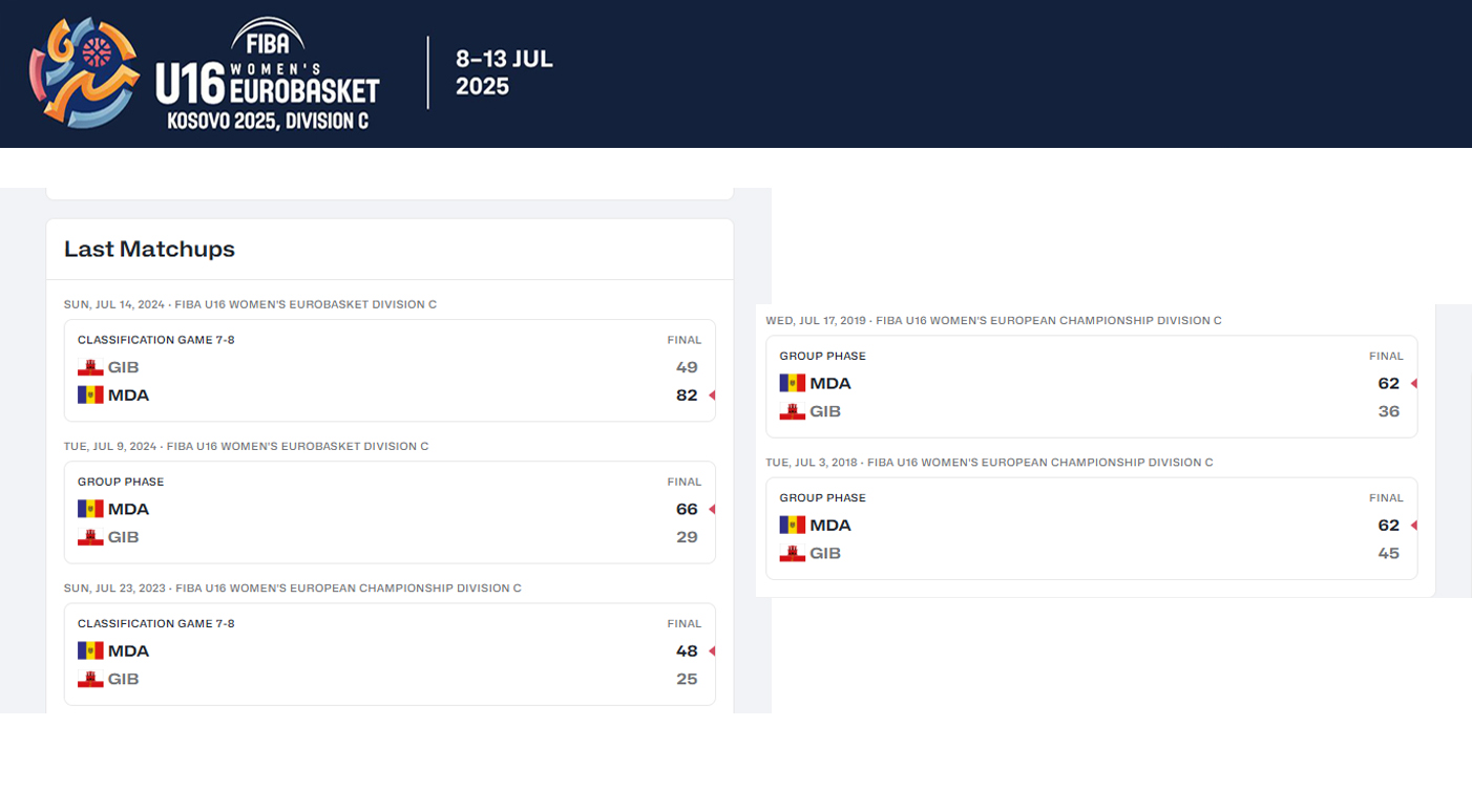 13 июля 2025 Чемпионат EuroBasket-2025 U16. Соперницами женской сборной Молдовы будет команда из Гибралтара. Начало игры 14:00.