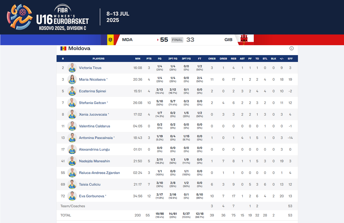 Последний официальный матч женского молодежного чемпионата Европы по баскетболу среди команд до 16 лет завершился радостью для болельщиков из Республики Молдова. Команда Молдовы выйграла у девушек из Гибралтара.