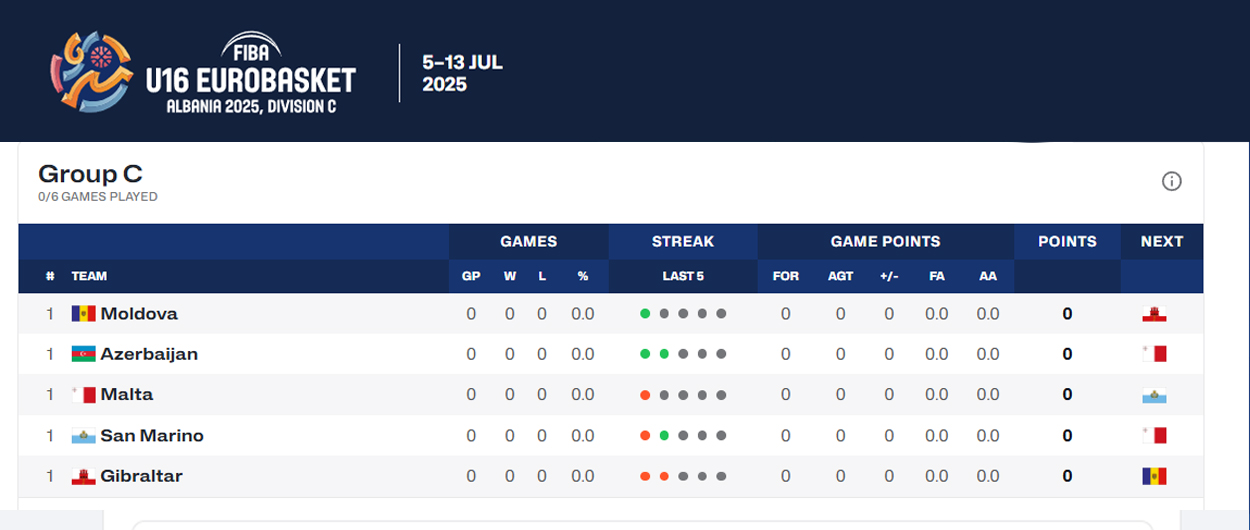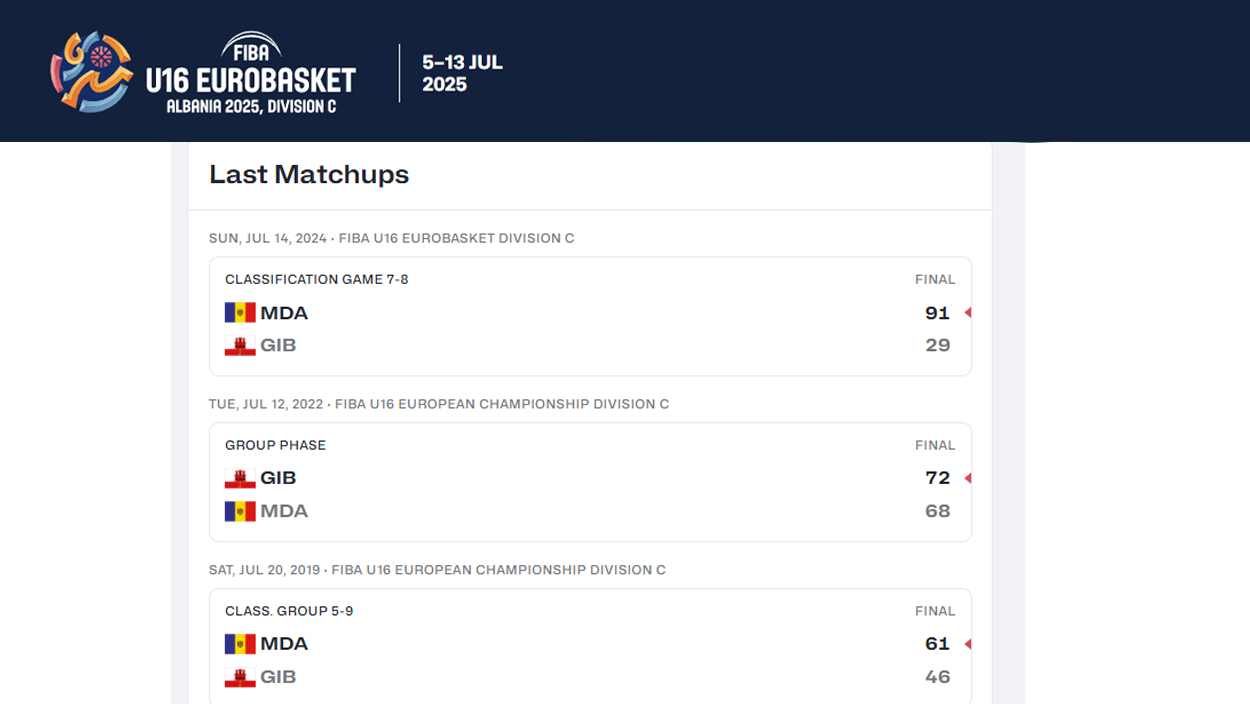 11 июля 2025 Чемпионат EuroBasket-2025 U16. Соперниками мужской сборной Молдовы будет команда из Гибралтара. Начало игры 18:00. Матч Group C (5-9).